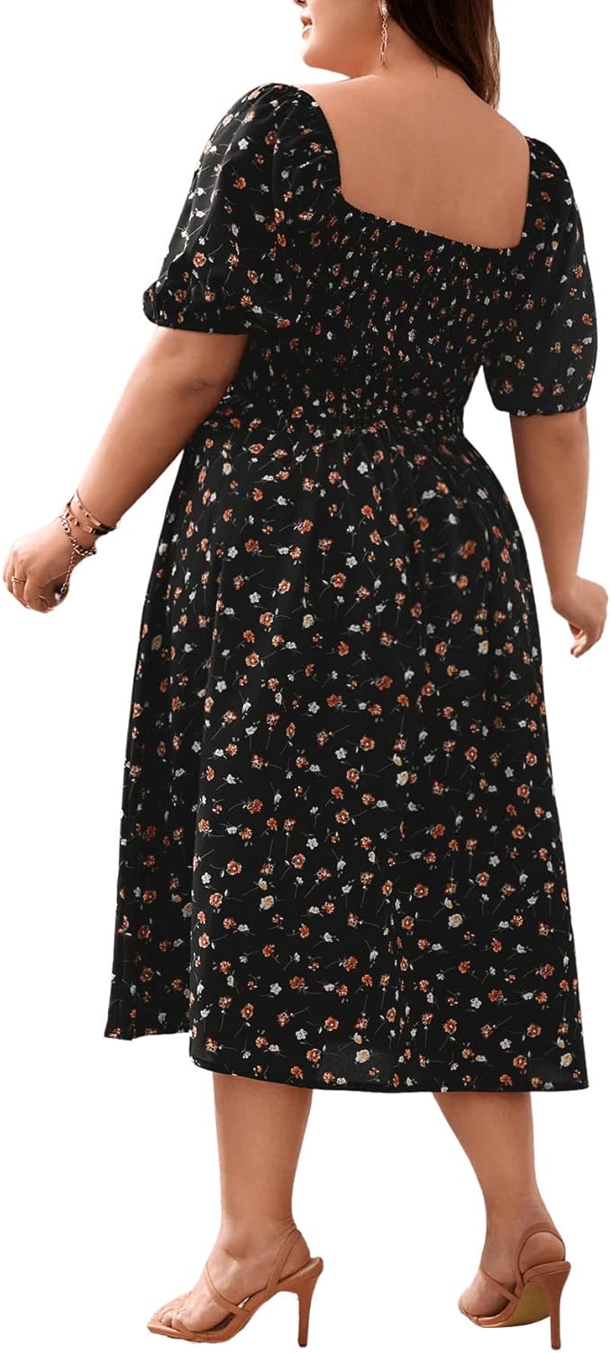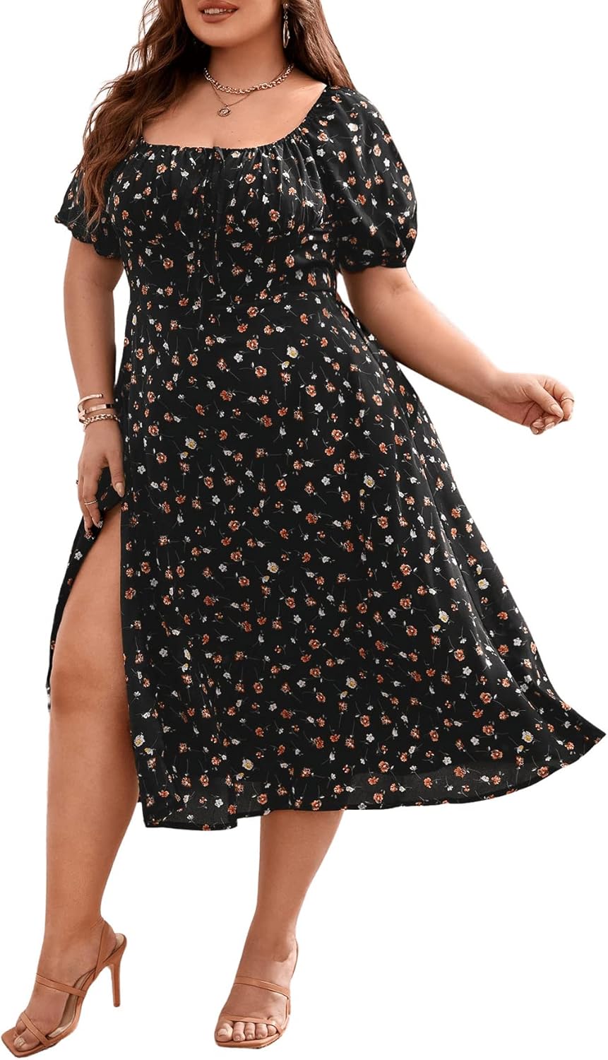 Women Plus Size Floral Print Tie Front Square Neck Slit Hem Midi Dress